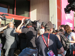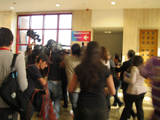 Dezenas de metros com os cabos das televisões a pregar rasteiras, cada um dos câmaras a tentar encontrar o melhor ângulo. Os fotógrafos a procurarem a melhor imagem. Os microfones a não quererem perder nenhum som. Os seguranças a fazerem barreira. Percurso atribulado que acabou por se revelar bem longo e ...perigoso! Atropelaram-se uns aos outros....